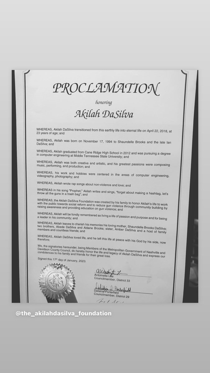 The Declaration of AKILAH Dasilva Was Declared on January 17,2023. We want to thank Nashville City Council for acknowledging AKILAH’s Life. We will carry his legacy and message of peace and ending gun violence . #LongLiveAkilah 💙 #Endgunviolence