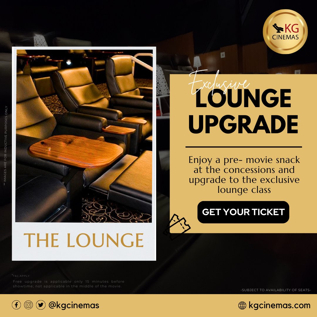 🌟 Elevate Your Movie Experience at KG Cinemas! 🍿 Upgrade your night out with a pre-movie snack at the concessions and indulge in the exclusive Lounge Class. ✨🛋️ Unwind in comfort and style – Book your tickets now! 🎬🎟️ #KGcinemas #LoungeUpgrade #MovieNightLuxury