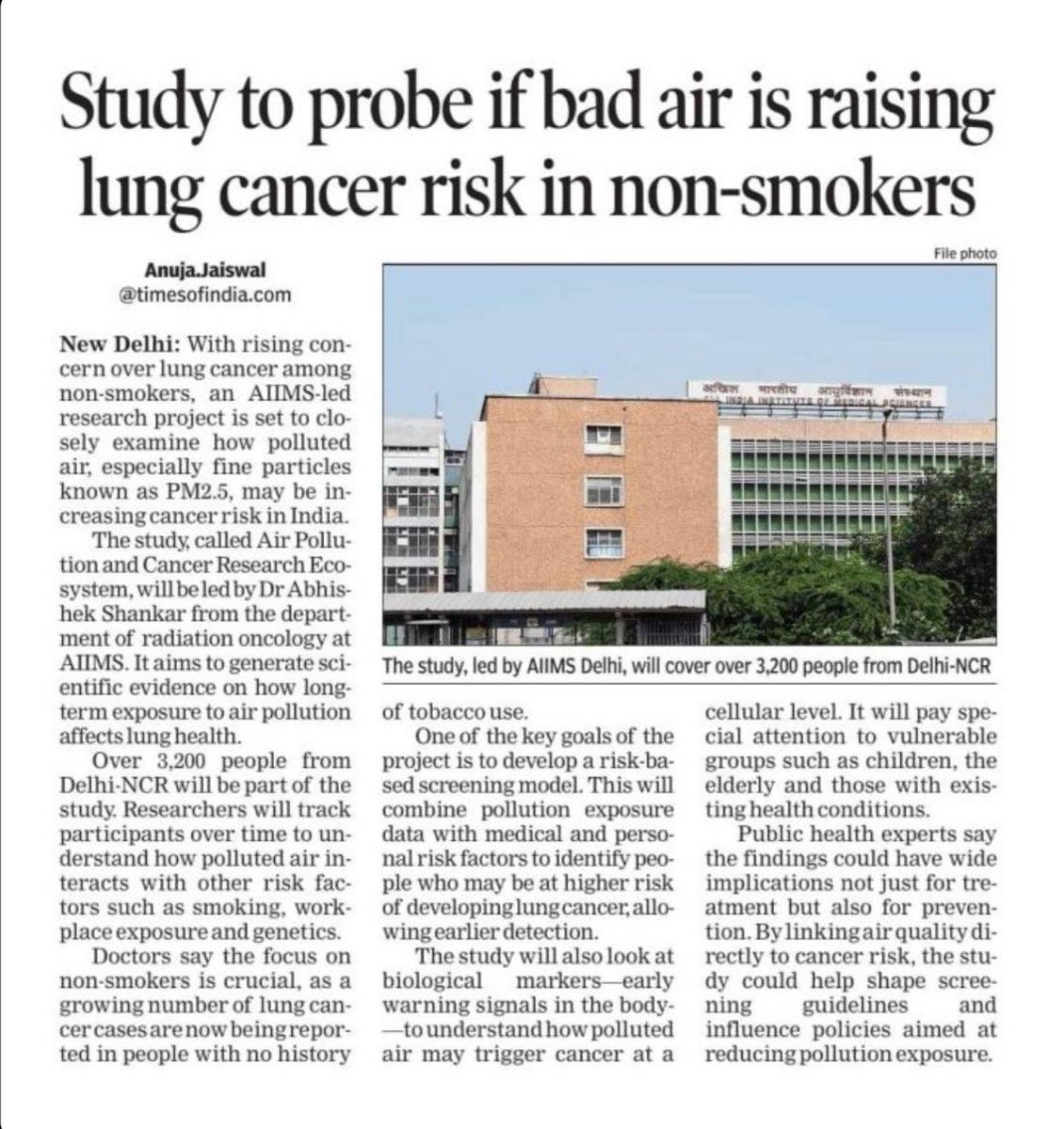 AIIMS is leading research on the link between air pollution (PM2.5) and lung cancer in non-smokers, tracking 3,200+ participants in Delhi-NCR. The study aims to understand risks, enable early detection, and inform future screening and policy decisions. #AirPollution #LungHealth