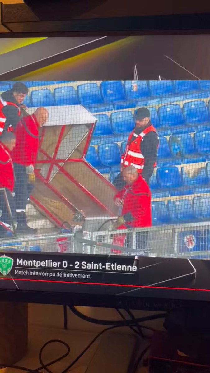 🚨 𝗦𝗖𝗘𝗡𝗘𝗦 𝗗𝗘 𝗖𝗛𝗔𝗢 𝗔 𝗟𝗔 𝗠𝗢𝗦𝗦𝗢𝗡 😬 Alors que l'ASSE mène 2 à 0 face à Montpellier, les supporters du MHSC jettent des fumigènes sur le terrain. Résultat : un stadier est blessé et le jeu est interrompu ! 🤬 #MHSCASSE 0-2