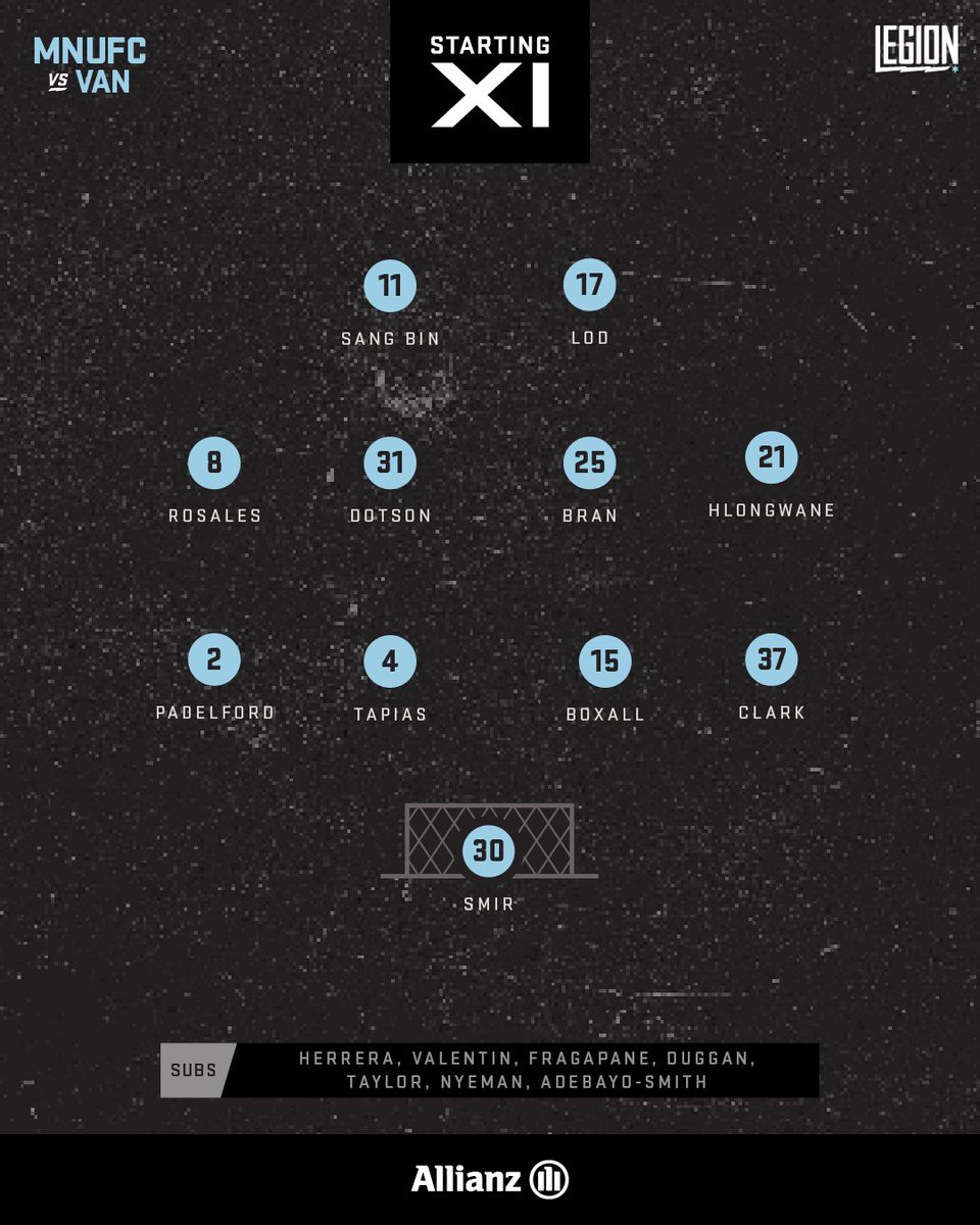 #MNUFC Starting XI #MINvVAN 3-4-3 / 5-4-1 🇰🇷 Sang Bin 🇫🇮 Lod 🇿🇦 Bongi 🇺🇲 Dotson 🇨🇷 Bran 🇭🇳 Rosales 🇺🇸 Clark 🇺🇸 Padelford 🇲🇽 Tapias 🇳🇿 Boxall 🇺🇸 Smir