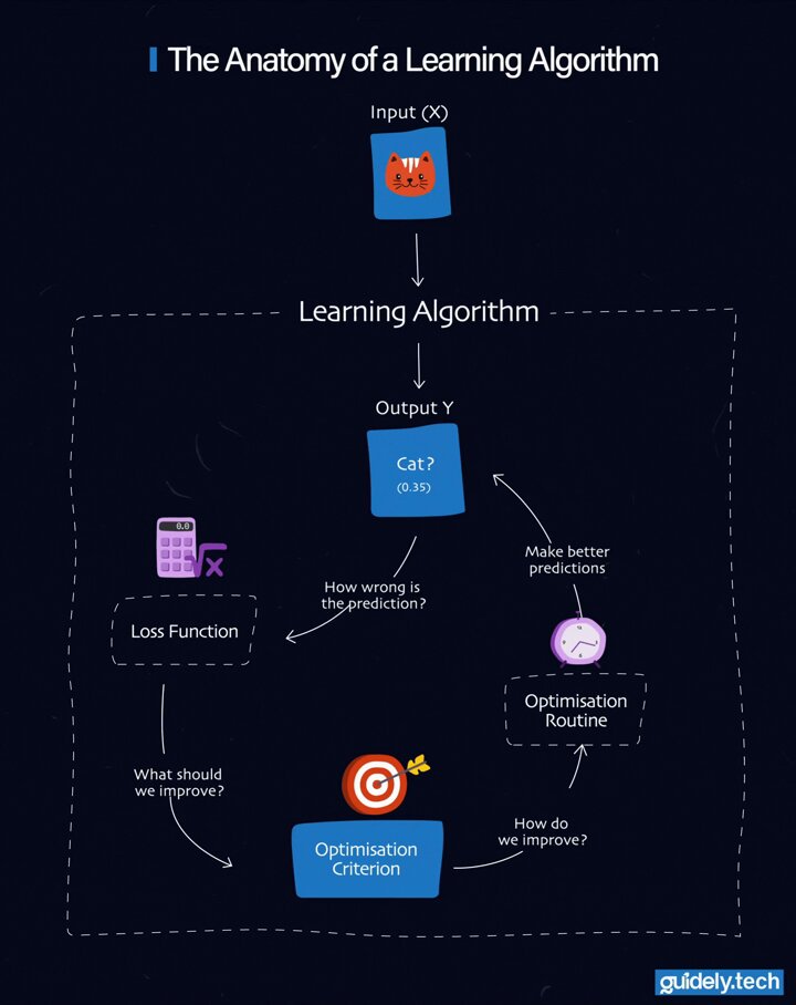 Give us 2 minutes and we will help you understand how a learning algorithm works! Learning algorithm ← (input X: cat image) → (output Ŷ: probability it’s a cat) Inside the learning algorithm, three parts work together: #machinelearningtutorial #artificial_intelligence