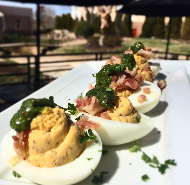 Start up your visit for Burger night with one of our March features! Our Irish deviled eggs, made with whole-grain mustard, sharp cheddar cheese, & topped with scallion purée and crispy bacon! #Yum #MarchMadness #MarchFeature #CapAleInnsbrook