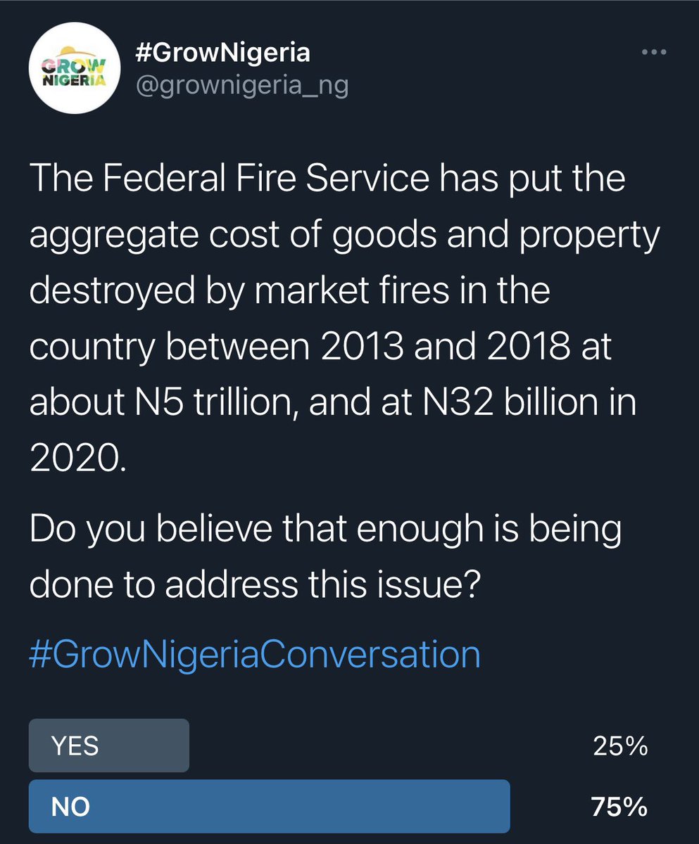 75% of respondents believe that we need to do more to curb #marketfires. 78% of respondents believe that #marketfires present a threat to our national economy. Join the #GrowNigeriaConversation tomorrow to listen to expert solutions. Register here: bit.ly/34c16jC