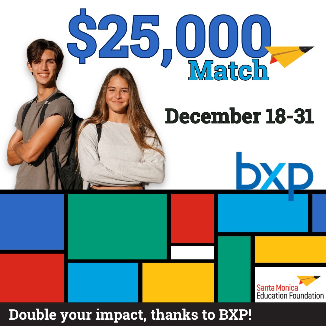 🌟 Your generosity fuels education! Help us meet BXP’s $25K match for Santa Monica students—every $ up to $25K donated by 12/31 goes TWICE as far! 💡 Support arts, STEM & vital classroom programs. 👉 Donate: smedfoundation.org/donate #MatchingGift