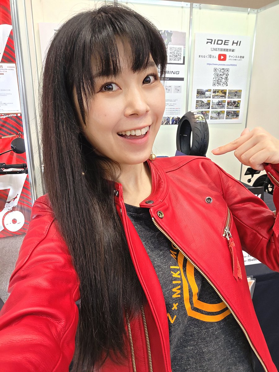 #MaxFritz さんの赤革ジャン! 今日モーターサイクルショーのレディスサポートスクエアで買っちゃった💰️ ずっと狙ってたモデルだったんだけど、まさかの半額以下の特別価格になってて買うしかなかった😂 来月の私、仕事がんばれ!!!