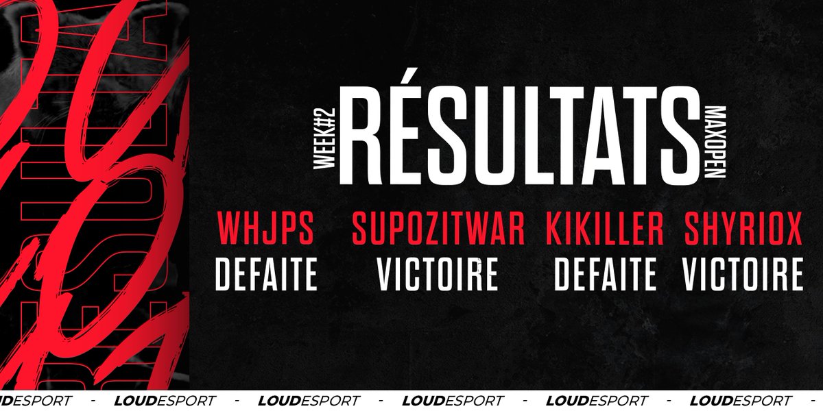 Fin de cette 4️⃣e semaine en #MaxOpenCup 😁 SupoZitWar 0️⃣-3️⃣ @HantsonAlex ❌ Kikiller 3️⃣-1️⃣ @Drakkenstorm ✅ Shiryox 3️⃣-0️⃣ BYE (forfait) ✅ Whjps 0️⃣-3️⃣ @sixOrHS ❌ Nouvelle semaine mitigée mais rien n’est terminé ! 😎 #BeLouder 🔴⚫️