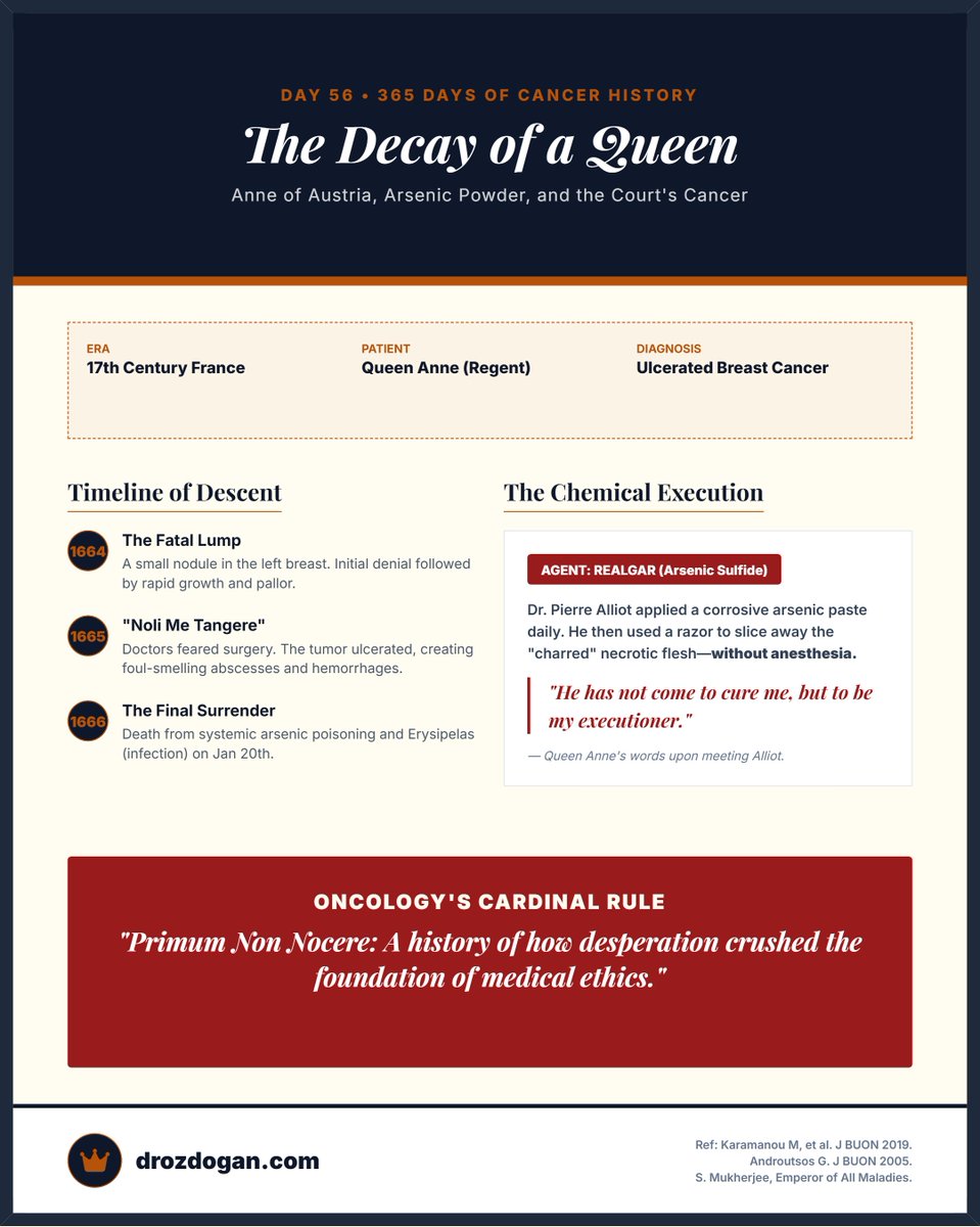A queen's desperation, a doctor's "chemical execution." 📜 Cancer History — Day 56/365 Discover the horrific story of 17th Century Queen Anne of Austria, whose ulcerated breast cancer was treated with corrosive arsenic paste—without anesthesia! #MedicalEthics
