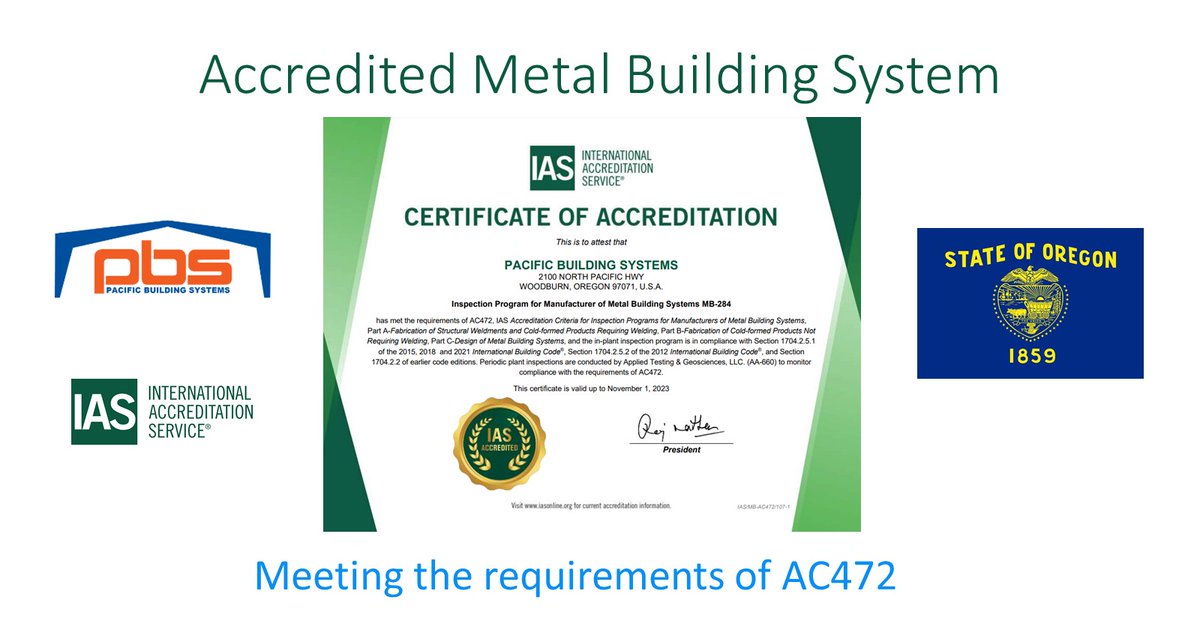 Congratulations Pacific Building Systems in Woodburn, Oregon, for becoming an IAS Accredited Metal Building System. Meeting the requirements of AC472 and Chapter 17 of the International Building Code. bit.ly/3eqXnrf #IASAccredited #PBS #MetalBuildingSystem #Oregon