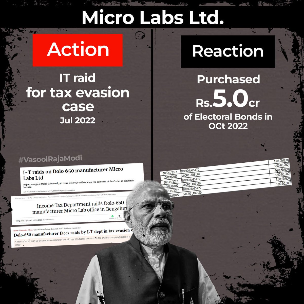 9. Following an Income Tax Department raid in July 2022 on suspicion of #tax evasion, Micro Labs Ltd. gave Rs. 5 crore to the #BJP using electoral bonds. #MicroLabs #IT #ElectoralBondScam #VasoolRajaModi