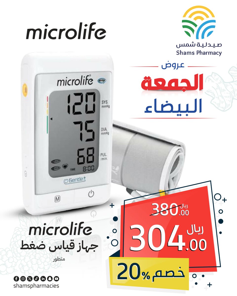🎉 عرض خاص من صيدليات شمس بمناسبة الجمعة البيضاء 🎉 اهتم بصحتك مع جهاز قياس الضغط الأكثر دقة وسهولة في الاستخدام من Microlife. الآن بخصم 20% بمناسبة الجمعة البيضاء 🛍️ #الجمعة_البيضاء #خصومات #Microlife #قياس_الضغط #صحة_القلب #صيدليات_شمس #عروض #تسوق_الآن