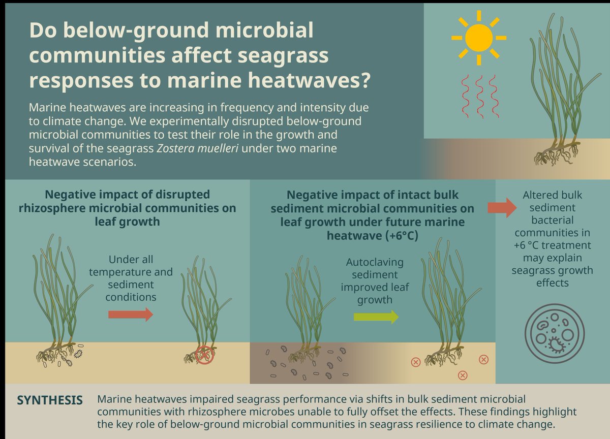 🌱🔥🌊 Marine heatwaves impact #seagrass via belowground #microbes! Rhizosphere microbes support growth, but bulk sediment microbes may hinder growth under heat stress.🦠 @SydneySOLES @DR_GRIB @elicario2 @joseelhart buff.ly/04FsN4K