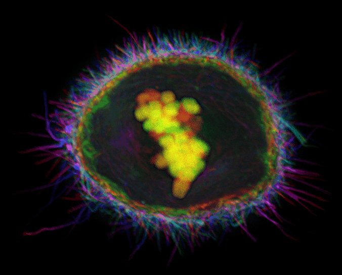 Holy Retraction Fibers Batman! When cells round up during mitosis, they often remain connected to the substrate by specialized actin bundles called retraction fibers. Sometimes they form a lot... Actin in this cell in metaphase is shown in purple. #CellBiology #microsocpy #SciArt