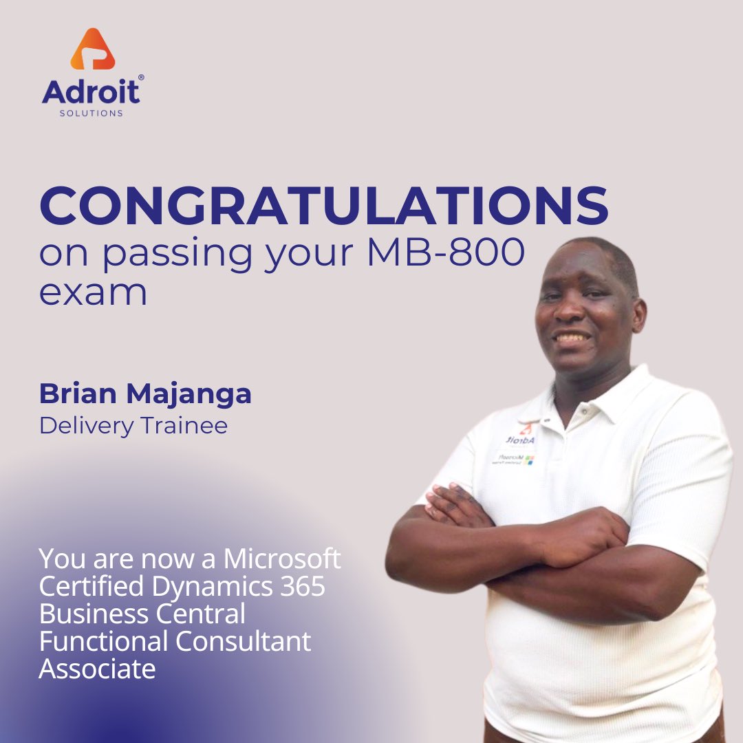 Congratulations to Brian Majanga on successfully passing the MB-800: Microsoft Certified Dynamics 365 Business Central Functional Consultant Associate exam! Your achievement reflects dedication and excellence. #CongratulationsBrian #AdroitSolutionsLimited #MicrosoftPartner