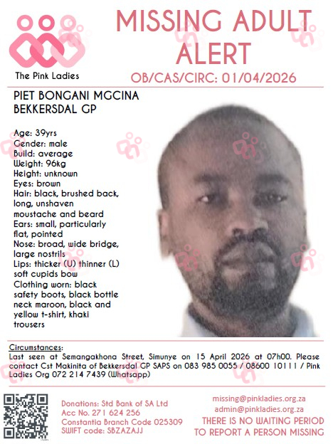 @ThePinkLadiesOr#MISSINGPinkLadies MISSING: Bekkersdal GP Piet Bongani Mgcina 39yrs 15 April 2026 NOTE: Admin will make any necessary announcements once confirmed by Saps and/or press releases. Pink Ladies Org #Missing Donate: pos.snapscan.io/qr/LTLjDBFb
