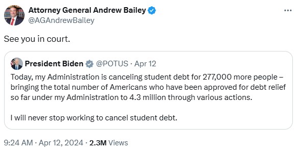Missouri used to lead large state coalitions under Eric Schmitt, including on the first student loan case. Andrew Bailey did not lead or join today's large coalition challenging Biden's latest student loan scheme. Thanks to Kansas AG @KrisKobach1787 for leading the charge. #moag