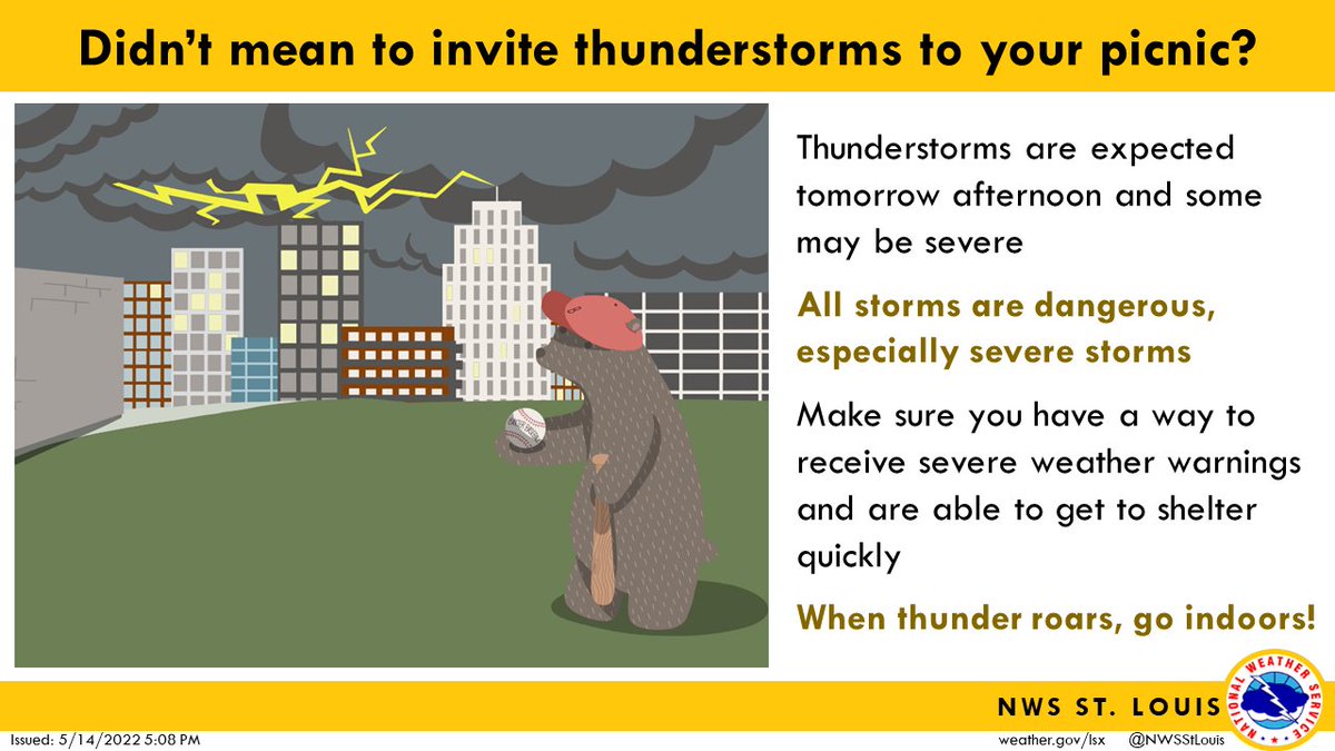 With storms in the forecast tomorrow, now's the time to start thinking about safety plans for any outdoor activities. Make sure you're paying attention to the weather and remember, when thunder roars, go indoors! #mows #ilwx #stlwx