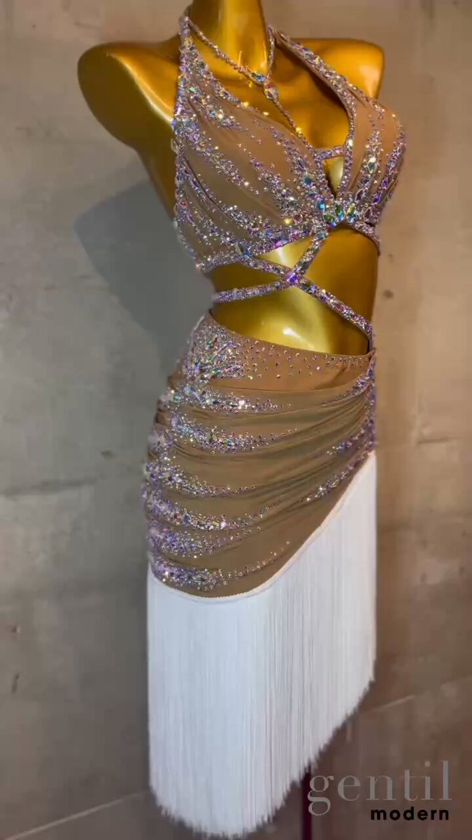 Modern Latin dress beige×aurora 体のラインをしっかり見せつつフリンジで動きを出してくれる1着✨ 動くたび輝く石がフロアでの確かな存在感を🍾 競技会などにいかがでしょうか? レンタルも可能でございます♪ お気軽にお問い合わせください🍀 品番:252237041 #gentil #Modren #rental