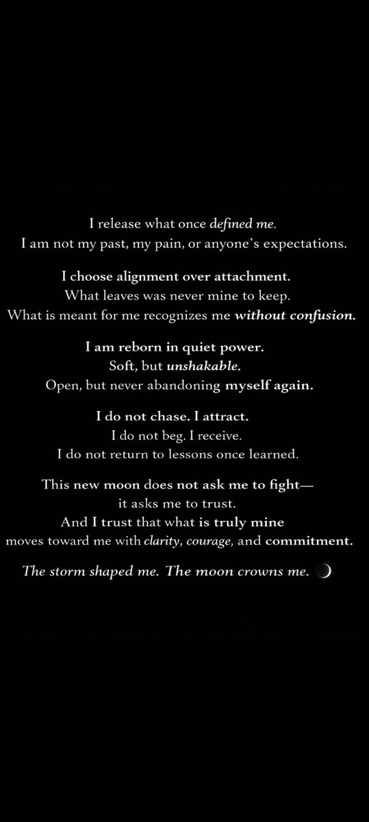 I release what once defined me. I am not my past, my pain, or anyone’s expectations. I choose alignment over attachment. What leaves was never mine to keep. What is meant for me recognizes me without confusion. The storm shaped me. The moon crowns me 👑 #MoniqueMent