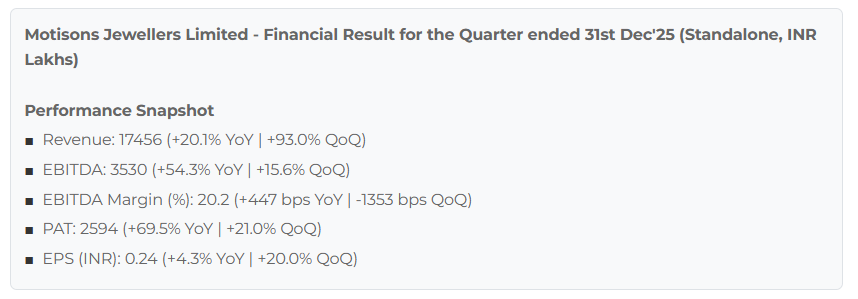 Motisons Jewellers Q3 2026 Earnings ~Revenue at ₹174.56 Crores, Up 20.13% YoY, Up 92.95% QoQ ~Net Profit at ₹25.94 Crores, Up 69.50% YoY, Up 21.03% QoQ #motisons #jewellery #Q3FY26 #StockMarketIndia