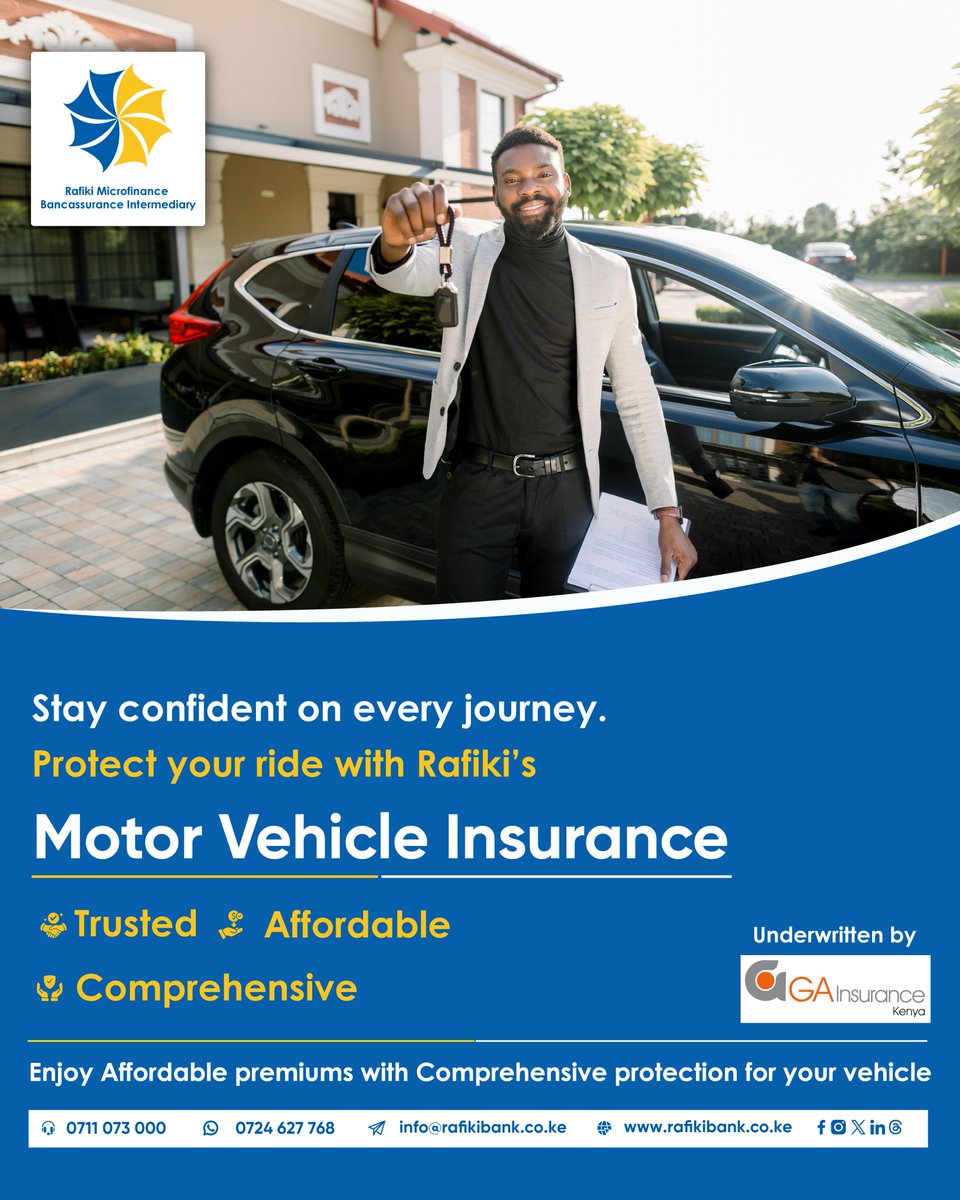 Get Rafiki’s Motor Vehicle Insurance for comprehensive protection that doesn’t break the bank. Trusted. Affordable. Comprehensive. Contact us to get a quote: 📞 0711 073 000 #ProtectYourRide #MotorVehicleInsurance #rafikibancassuranceintermediary