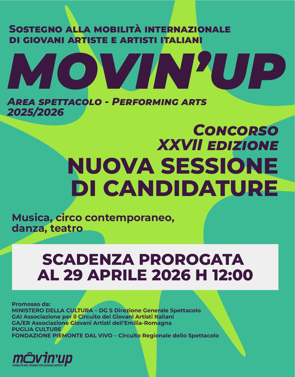 PROROGA DEL TERMINE DI PARTECIPAZIONE al bando MOVIN'UP Spettacolo - Performing Arts 2025/2026 📅 𝗺𝗲𝗿𝗰𝗼𝗹𝗲𝗱ì 𝟮𝟵 𝗮𝗽𝗿𝗶𝗹𝗲 𝟮𝟬𝟮𝟲 alle ore 12.00 (ora italiana) Info 🔗 bit.ly/3QB58gT @giovaniartisti #mobilitàartistica #movinup #spettacolodalvivo #artists