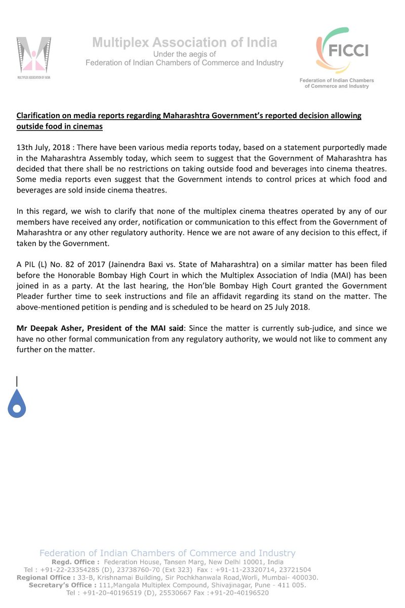 Clarification on media reports regarding Maharashtra Government’s reported decision allowing outside food in cinemas. #MultiplexAssociationOfIndia #MAI @ficci_india #Multiplex #OutsideFood #FICCI #PressNote #NewsRelease