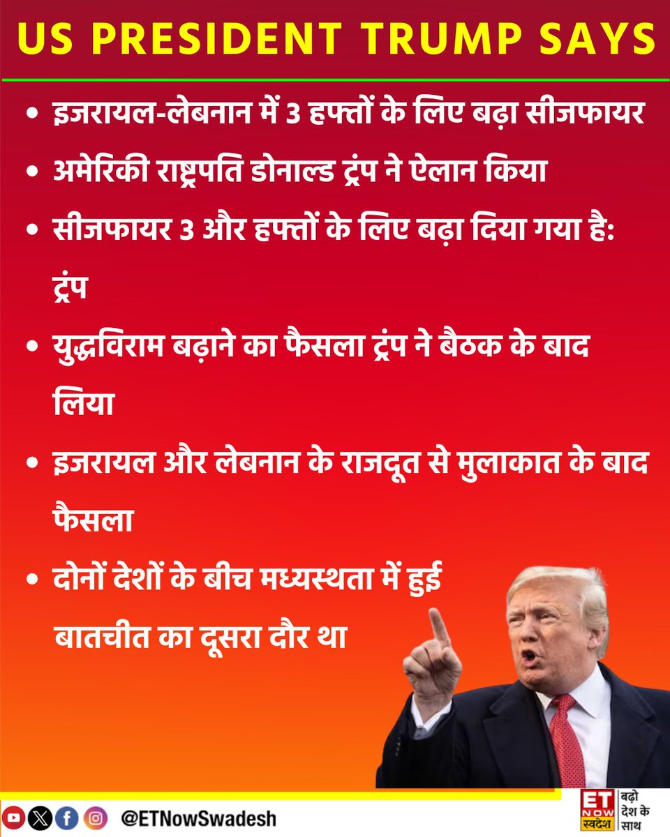 #NewsUpdate | इजरायल-लेबनान में 3 हफ्तों के लिए बढ़ा सीजफायर, अमेरिकी राष्ट्रपति ट्रंप ने ऐलान किया #DonaldTrump #ETNSNews #Trump #IranIsrael #Lebanon #Ceasefire