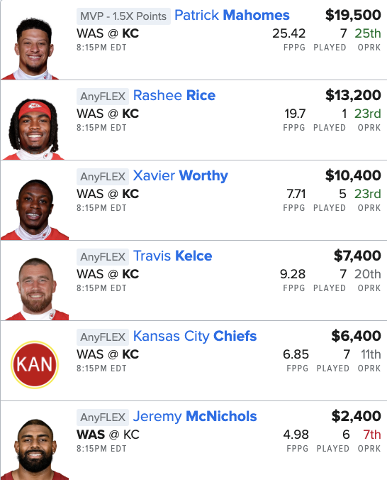 🏈 NFL FanDuel Monday Night Showdown Lineup - WAS/KC (10/27) 🏈 Monday Night Football! Kansas City: Mahomes ($19,500 - MVP) Rice ($13,200) | Worthy ($10,400) | Kelce ($7,400) | Chiefs DST ($6,400) Washington: McNichols ($2,400) #NFLFantasy #FanDuel #DFS #MNF #ChiefsKingdom