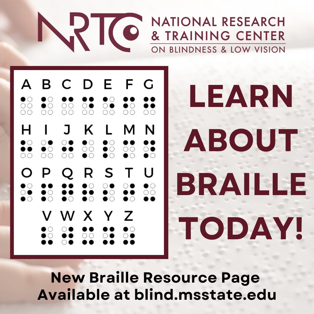 Braille is key for literacy & job opportunities for people with vision loss. Check out studies, courses, & resources on our new Braille page: blind.msstate.edu/our-products/b… #NIDILRR #NRTC #Blindness #LowVision #Braille #Employment #BrailleLiteracy