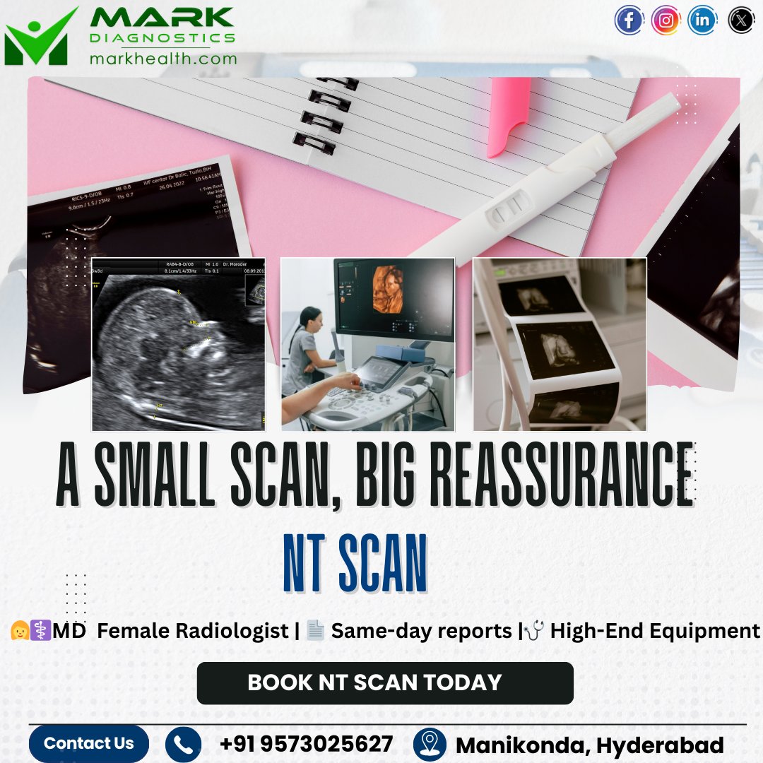 Early pregnancy screening you can trust ๐ค NT Scans for babyโs development check ๐ฉโโ๏ธ Female Radiologist โฑ๏ธ Fast & hassle-free ๐ Reports without delay ๐ Manikonda, Hyderabad ๐ +91 9573025627 #NTScan #EarlyPregnancyCare #Ultrasound #HealthyPregnancy #MarkDiagnostics