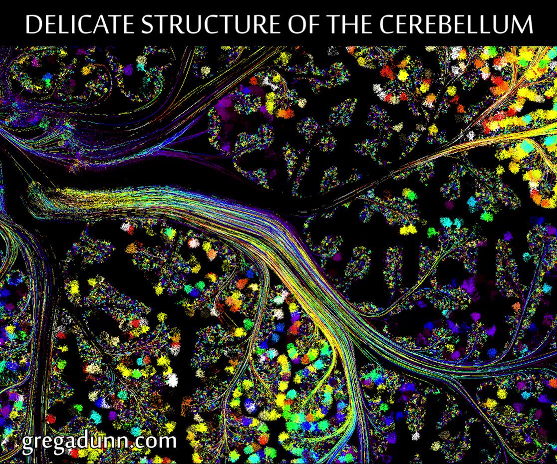 Each of those big purkinje cells firing has up to 100,000 synapses. One of the most beautiful regions of the brain IMO. bit.ly/3GtWic5 #neuralcircuit #brain #sciart #science #neuron #biology #mind #brainart #psychedelic #neurology #neurologist #brainhealth