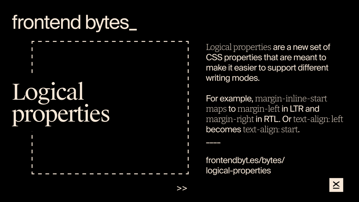#newformat at 9elements – 💡frontend bytes_ Every Tuesday, our #frontend crew and anyone interested gather to discuss various frontend topics. One of the first topics was #logical #properties in #CSS Read all about logical properties here 👇frontendbyt.es/bytes/logical-…