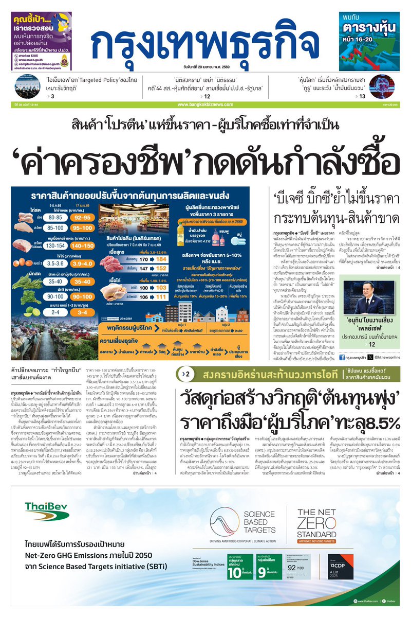 หน้า 1 หนังสือพิมพ์ฉบับต่างๆเช้านี้ กรุงเทพธุรกิจ วันที่ 20 เมษายน 2569 20 April 2026 #Thailand #newspaper #frontpage