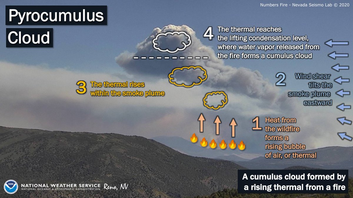 The #NumbersFire southeast of Gardnerville, Nevada, created several pyrocumulus clouds this afternoon during peak heating. Here is an infographic describing how a pyrocumulus cloud is formed.