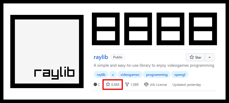 Hey! #raylib reached **8888 stars** on GitHub!!! Some people consider it a lucky number! What does it mean for you??? #onebyte #octal #prosperity #scorpio #music #nes #engine #knot #octopus #spiders #oxygen