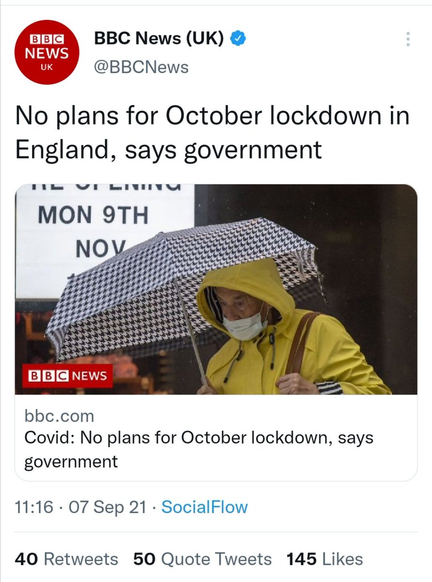 UK Government "rules out October firebreak lockdown"... You mean like they ruled vaccine passports out? #NoMoreLockdowns #SackZahawi #Octoberlockdown #TaxTheRich #socialcare #LiarJohnson #JohnsonOut #care #Trending