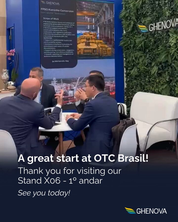 A great start at OTC Brasil! Many clients and partners visited our booth X06, reaffirming Ghenova’s quality and technical expertise in the Offshore sector. Join us this Wednesday at 17:30 for a networking cocktail! #OTCBrasil #Ghenova #OffshoreEngineering