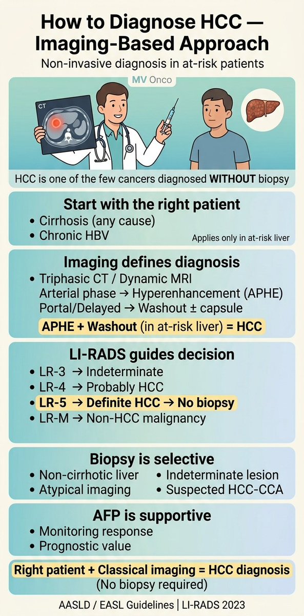 HCC is one of the few cancers you can diagnose WITHOUT biopsy 👇 Right patient + arterial enhancement + washout = diagnosis LI-RADS LR-5 seals it Simple. Practical. Powerful. #MVOnco #HCC #Oncology #MedEd