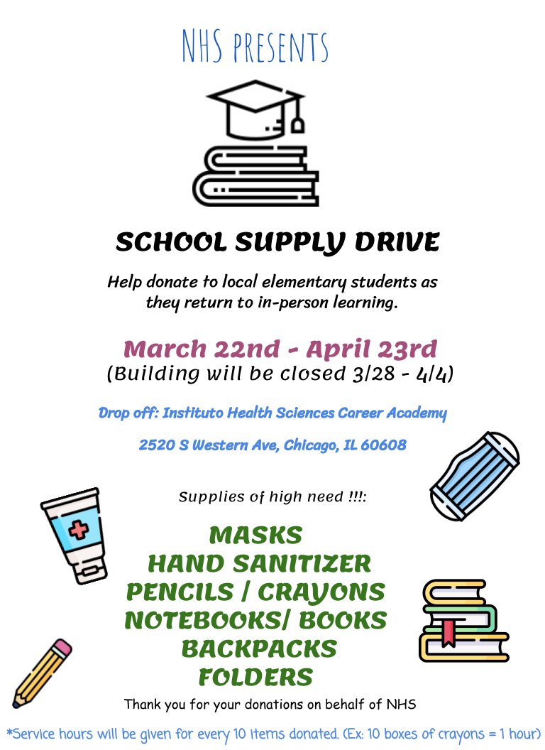 IHSCA's National Honor Society students are collecting supplies to help local elementary students go back to school and they need your help! You can drop off school supplies, masks, and hand sanitizers at 2520 S Western Ave until April 23. #OneDynamicInstituto