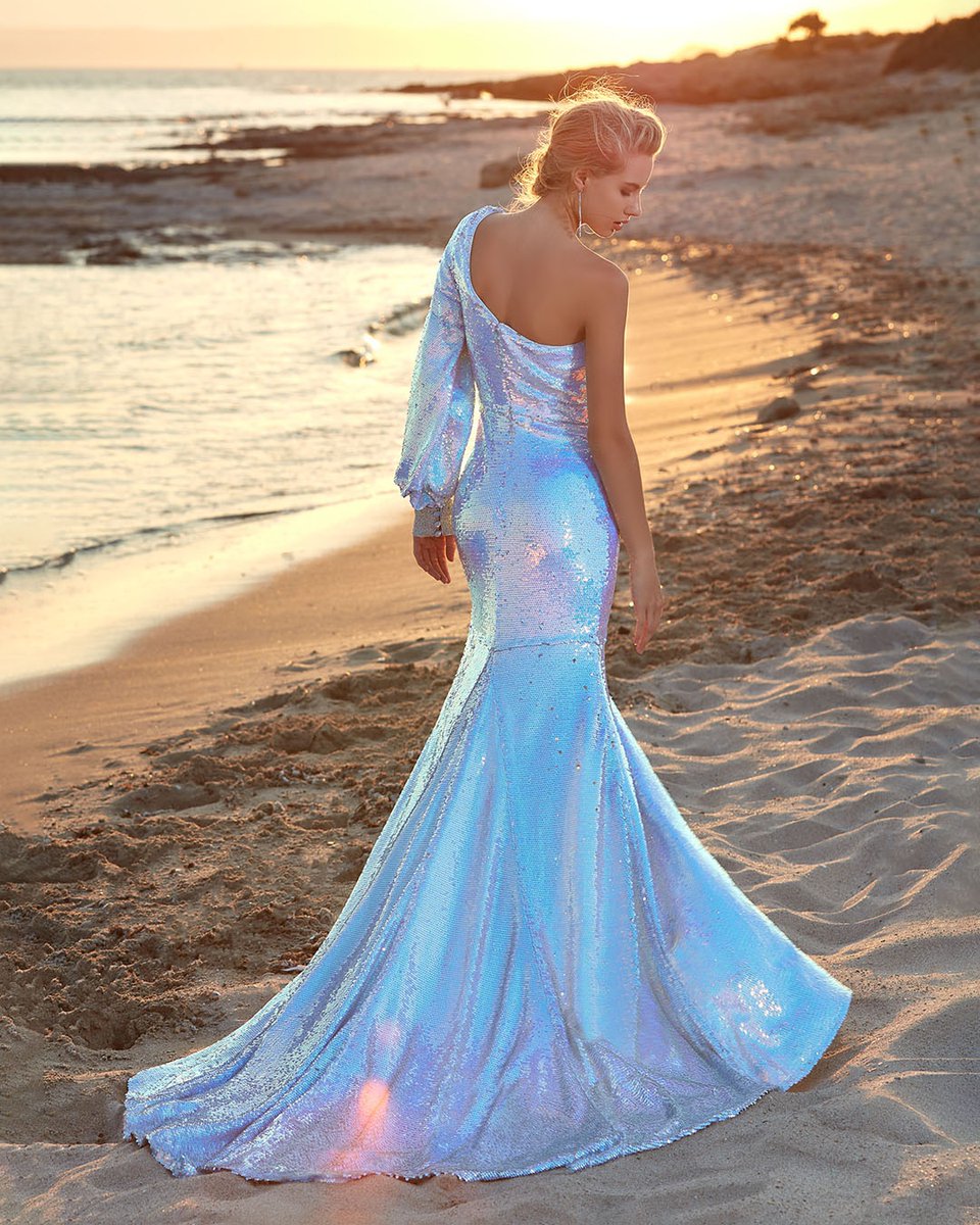 Style 61207 - A dazzling, iridescent sequin one-shoulder gown featuring a jewel embellished cuff, adjustable zipper slit, and a dramatic train to complete the look. 🛍️ l8r.it/x94d #alyceparis #oneshoulder #oneshoulderdress #promdress #promdresses