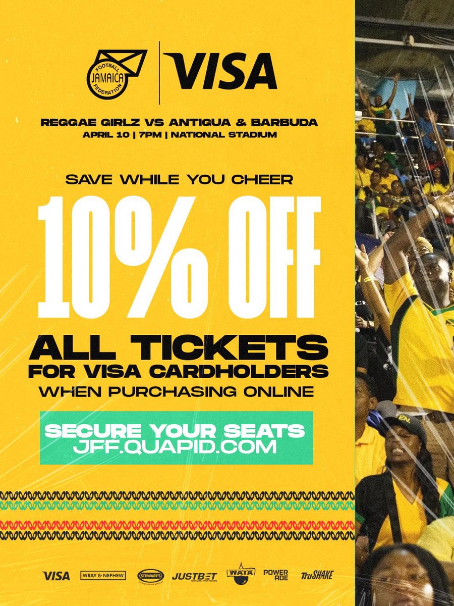 Your Visa card just became your ticket to history. 💳💛💚🖤 10% OFF ALL TICKETS FOR VISA CARDHOLDERS when purchasing online at jff.quapid.com. #ReggaeGirlz #AllAhWi #OneTeam #RoadTo2027 #Jamaica #WorldCup2027 #JamaicaFootball #SpiritOfFootball #FromYardToTheWorld