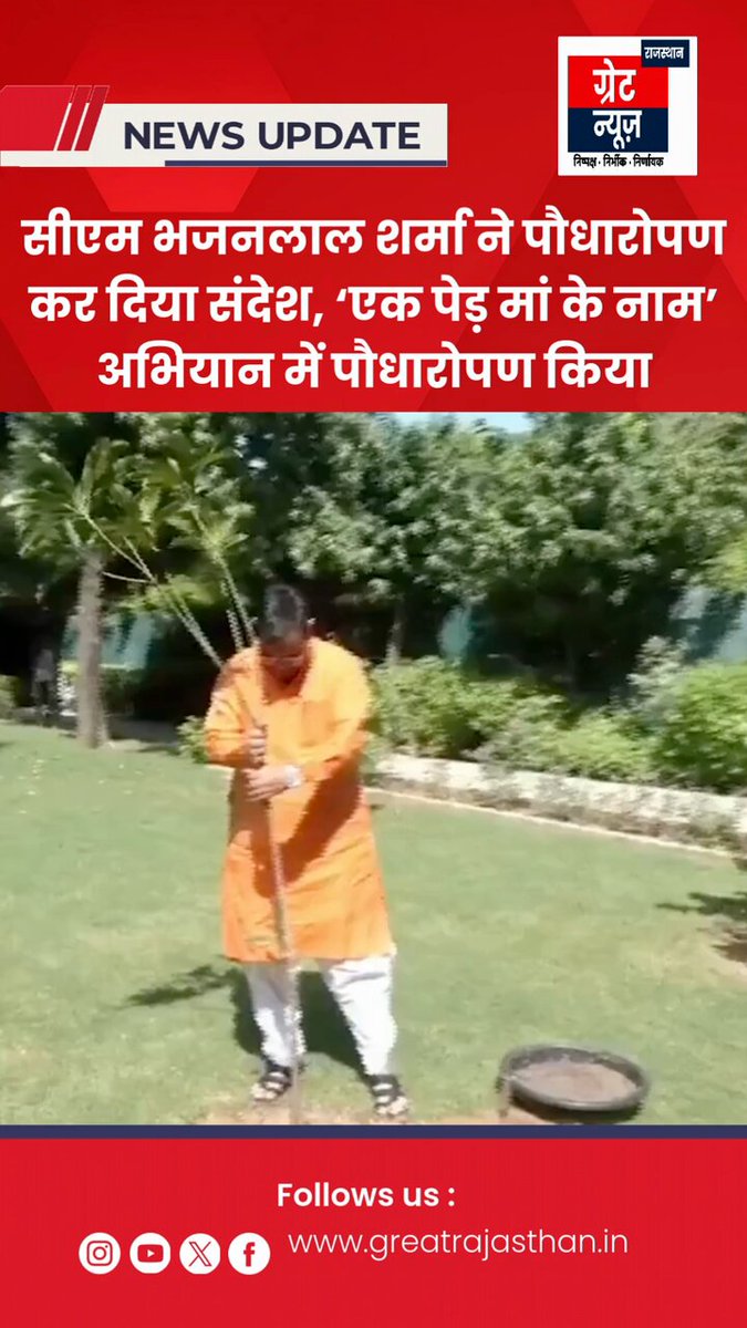 सेवा पखवाड़ा’ कार्यक्रम के तहत सीएम भजनलाल शर्मा ने मुख्यमंत्री निवास पर ‘एक पेड़ मां के नाम’ अभियान में पौधारोपण किया। उन्होंने प्रदेशवासियों से आह्वान किया कि सभी लोग अपने घर, आंगन, कार्यालय व सार्वजनिक स्थलों पर पौधे लगाकर उनकी देखभाल करें #CMBhajanlalSharma #OneTreeForMother