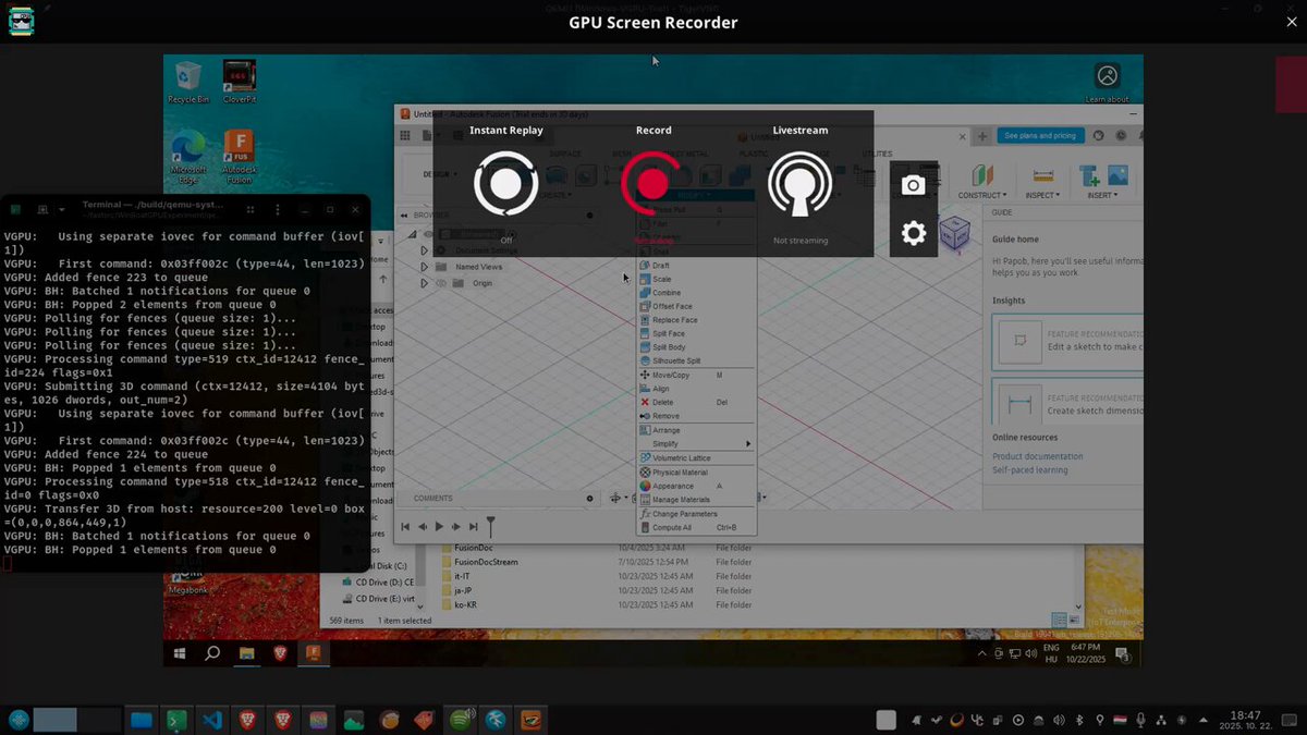 📐Early GPU Acceleration Progress - Part 3 AutoDesk Fusion working with OpenGL backend. This is really big for CAD folks. AutoDesk plans to remove OpenGL in new versions of Fusion, but I think you can keep using the current one and have it working. #winboat #linux #opengl #CAD