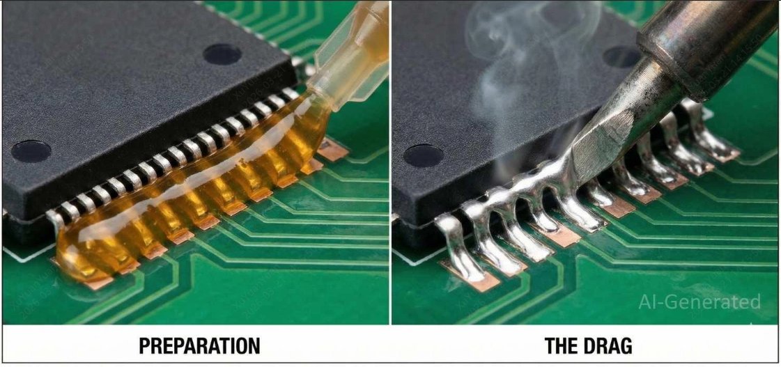 Drag soldering fine-pitch ICs in 5 steps: 1/ Tack corners first 2/ Gel flux strip across pins 3/ Hoof tip + small solder ball 4/ Drag—solder snaps to pads 5/ Bridge? Fresh flux + clean tip fixes it Pro tip: Preheat board to 40–50°C. #Soldering #FinePitch #PCBA #JLCPCB