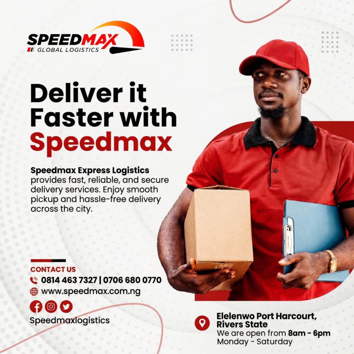 🚀 Need fast delivery in Port Harcourt? Speedmax Express Logistics got you covered! 📦 Safe • Fast • Reliable 📞 0814 463 7327 | 0706 680 0770 Deliver smarter with Speedmax 💥 #Speedmax #Logistics #PHC