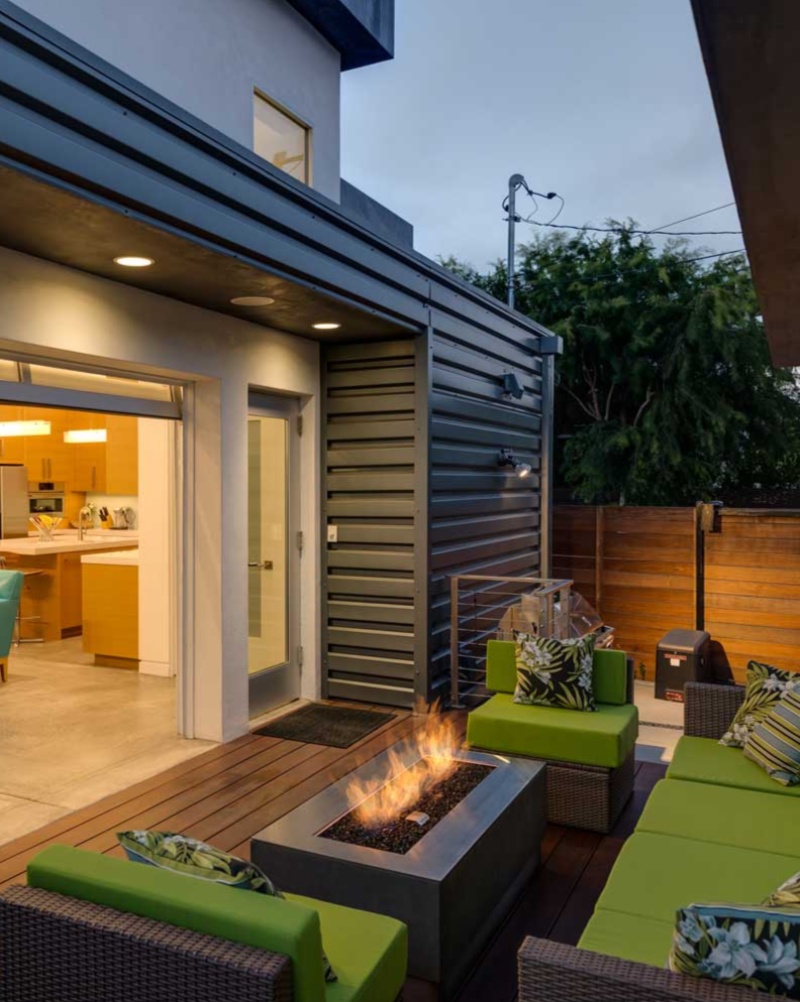 The clean, linear form of the Robata fire pit perfectly complements the modern lines of this home, creating a sophisticated and inviting outdoor lounge. #Paloform