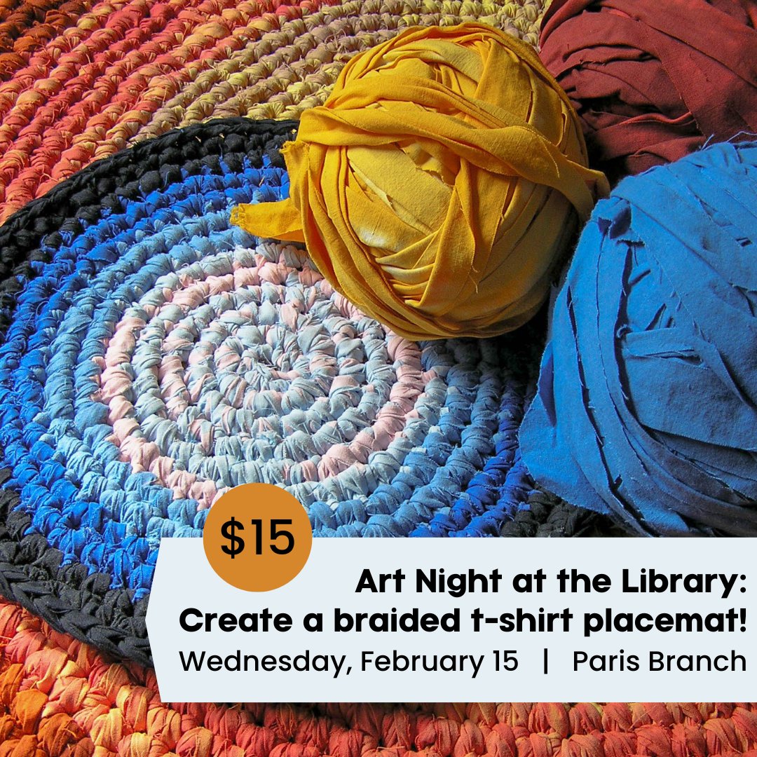 Sign up to learn how to make a braided t-shirt placemat! This workshop takes place at the #ParisBranch on Wednesday, February 15 (6:30 PM). Registration and a materials cost of $15 is required. Connect with your local #BrantLibrary branch and sign up with staff. #BrantArt