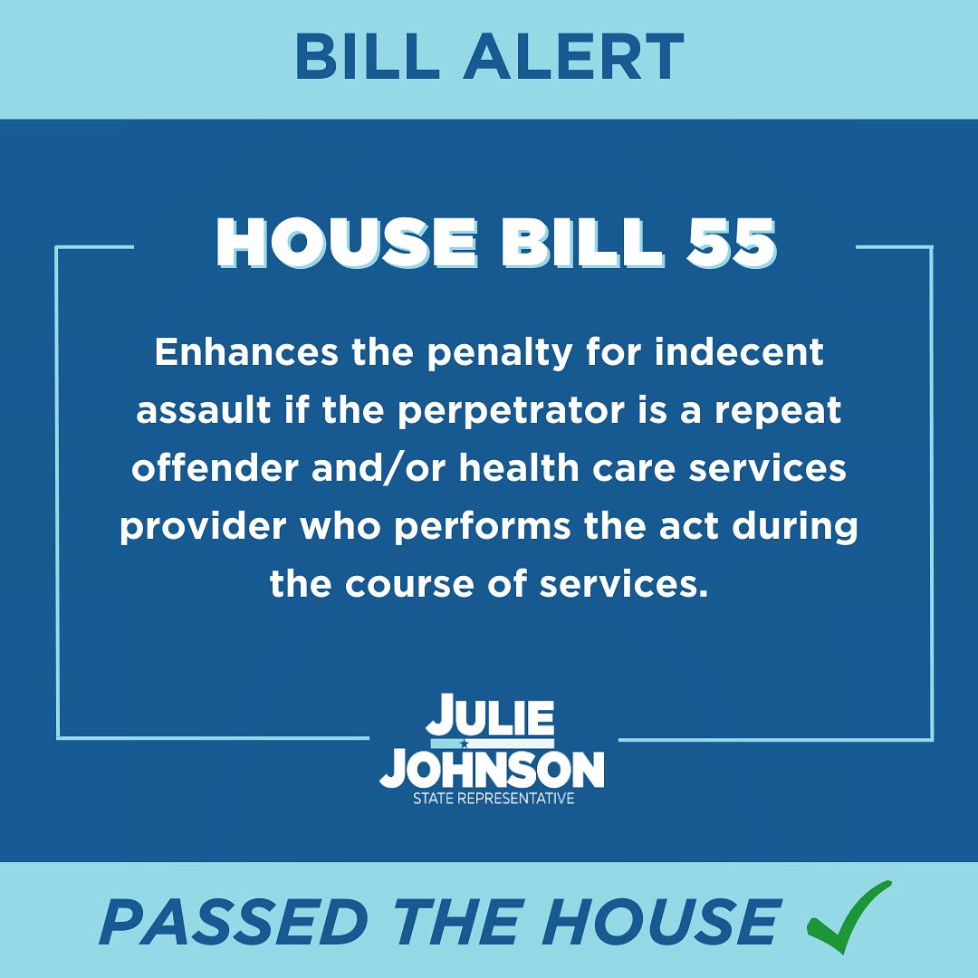 BILL ALERT: We just passed another bill out of the Texas House! #HB55 enhances the penalty for indecent assault if the perpetrator is a repeat offender and/or health care services provider who performs the act during the course of services. #HD115 #patientprotection