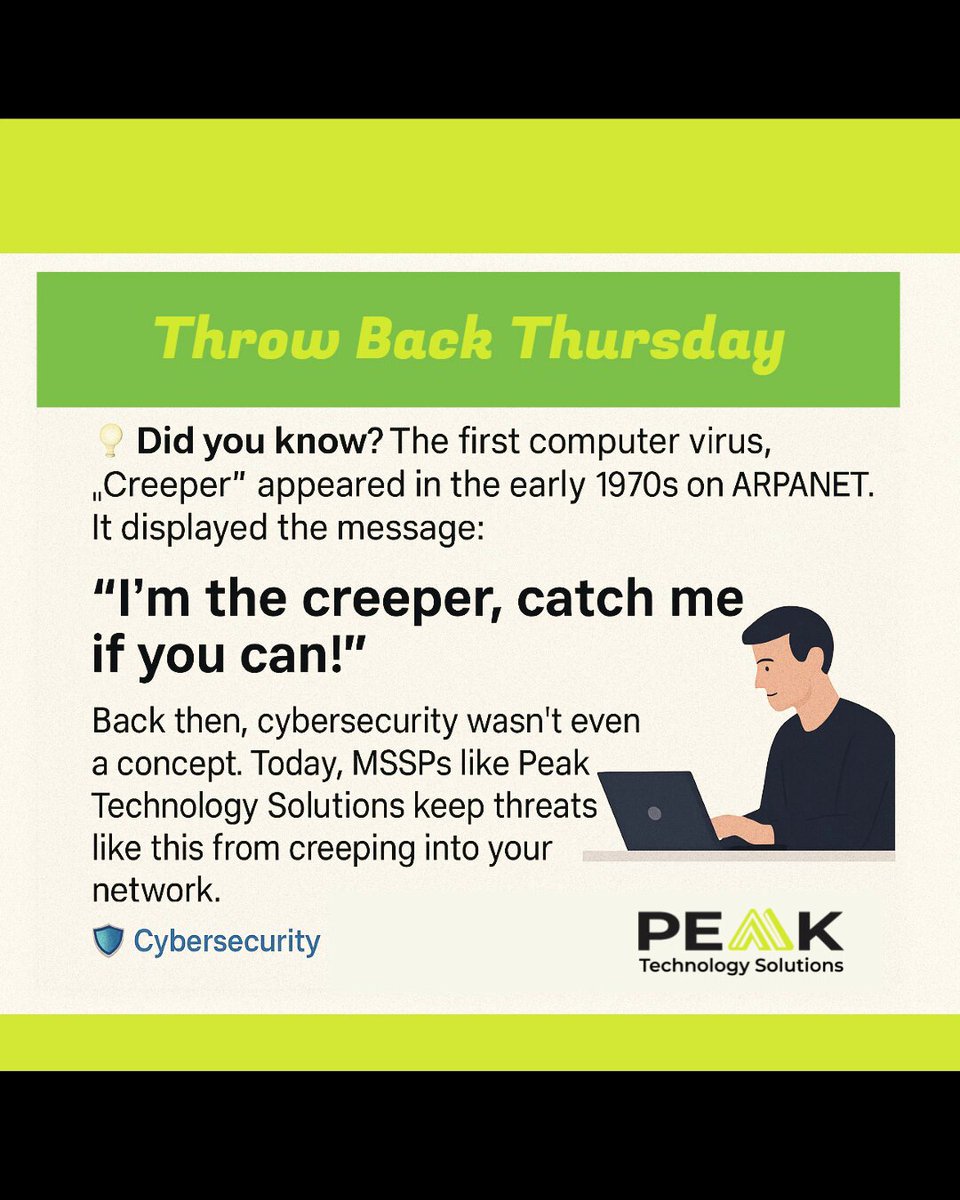 Throwback Thursday! Did you know edition. The first Virus was called "Creeper"! #ITHistory #PeakTEch #MSSP #Catchmeifyoucan